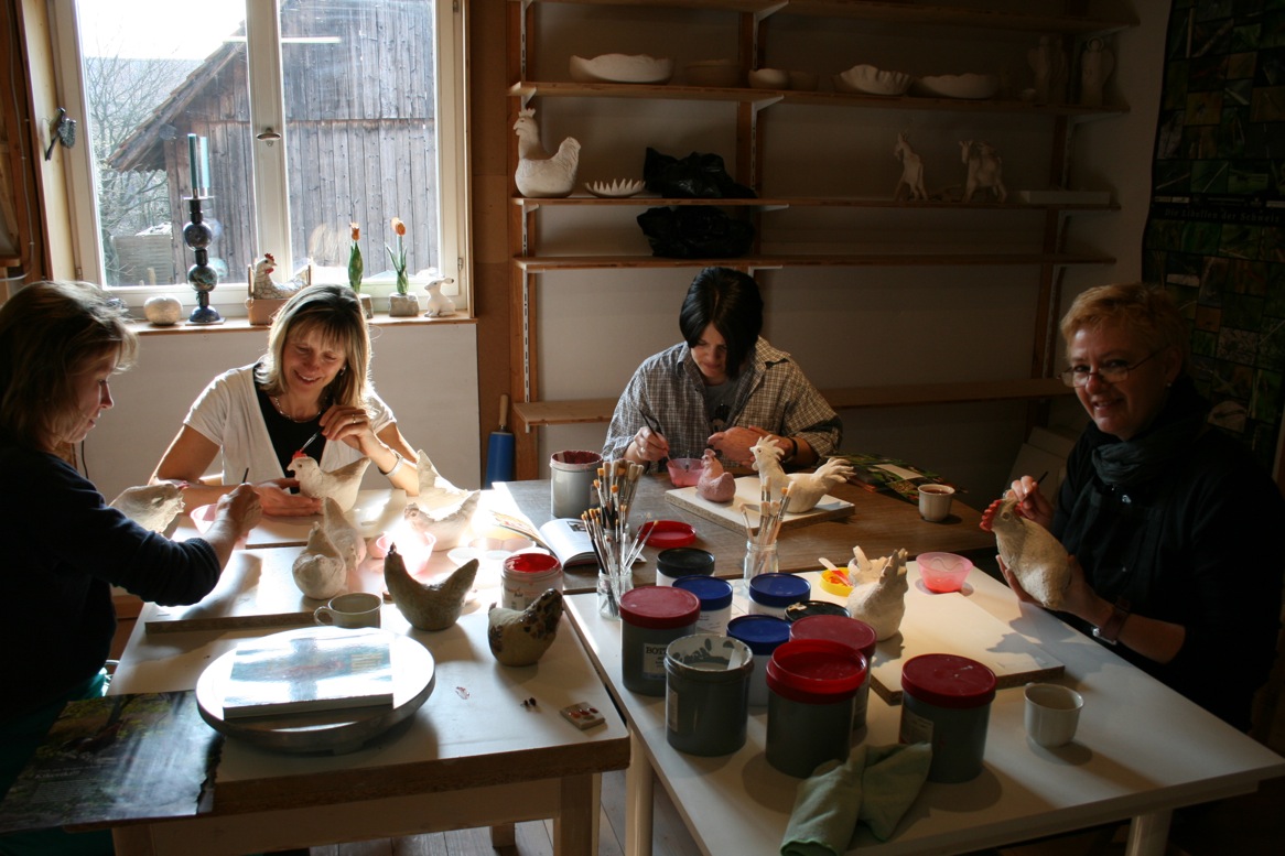 Sie kaufen bei mir den Ton, arbeiten daheim und bringen mir Ihre Werke zum Brennen. Sie können bei mir auch Gipsschalen, Werkzeuge und anderes Zubehör dafür ausleihen. Auch Glasuren zum Anmalen können Sie bei mir beziehen.